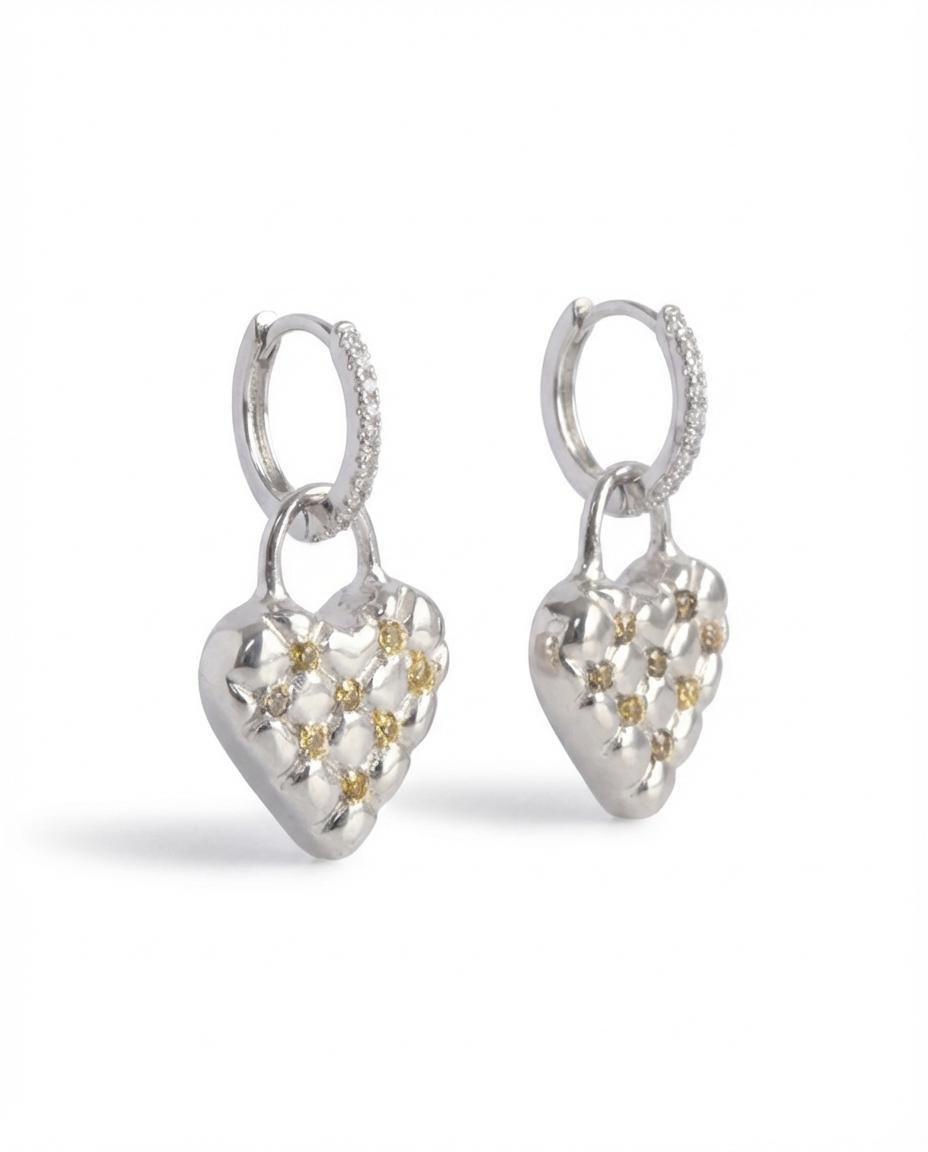 Available in solid 925 Sterling Silver, 2 varieties. Gemstone selection for the heart: Natural yellow sapphires (0.025 CT) or Lab-grown Moissanite (0.025 CT). The ear hoops are set with white zirconia.